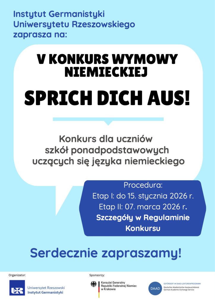 Posted in ROK 2021 Drodzy Uczniowie! Instytut Germanistyki Uniwersytetu Rzeszowskiego zaprasza uczniów szkół średnich zainteresowanych językiem niemieckim do udziału w V Konkursie Wymowy Niemieckiej.Szczegóły u nauczycielki j. niemieckiego Renaty Wagner-Siwiec.
