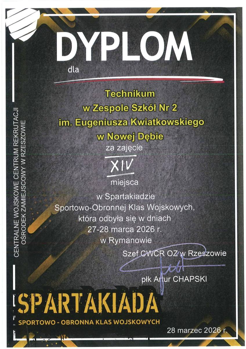 Uczniowie Technikum w Zespole Szkół nr 2 im. Eugeniusza Kwiatkowskiego w Nowej Dębie – reprezentanci klas I i III Oddziału Przygotowania Wojskowego (OPW) – godnie reprezentowali naszą szkołę podczas Spartakiady Sportowo‑Obronnej Klas Wojskowych, która odbyła się w dniach 27–28 marca 2026 r. w Rymanowie.