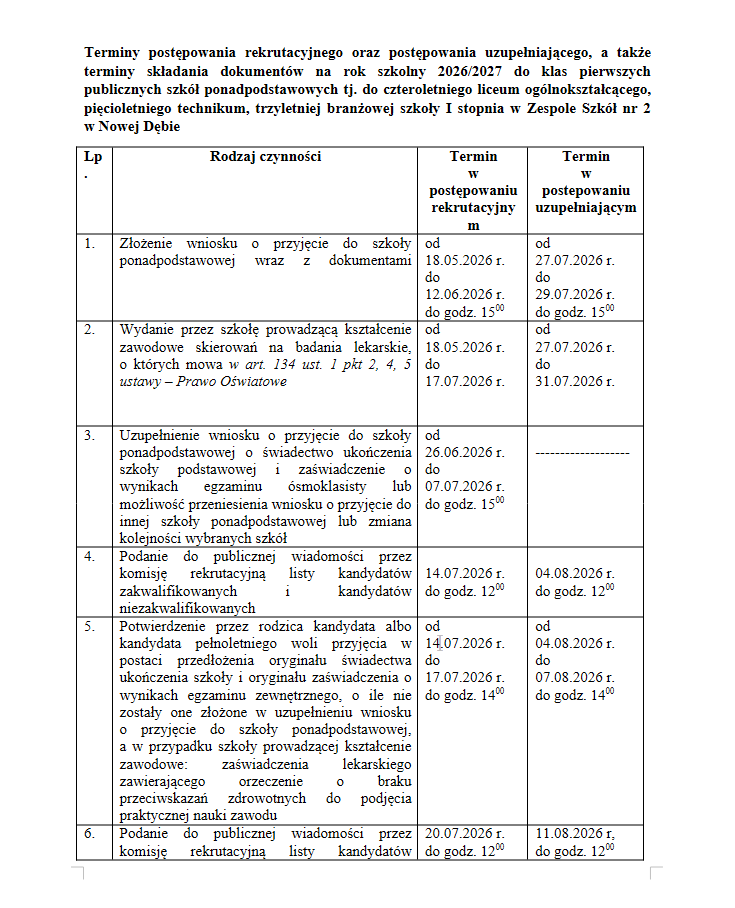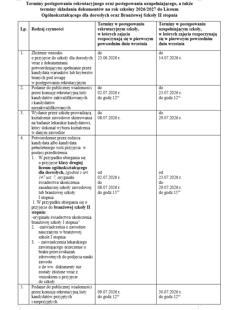 Terminy rekrutacji 2026/2027 Terminy rekrutacji do 4-letniego liceum ogólnokształcącego, 5-letniego technikum, 3-letniej branżowej szkoły I stopnia Terminy rekrutacji do Liceum Ogólnokształcącego dla dorosłych oraz Branżowej Szkoły II stopnia